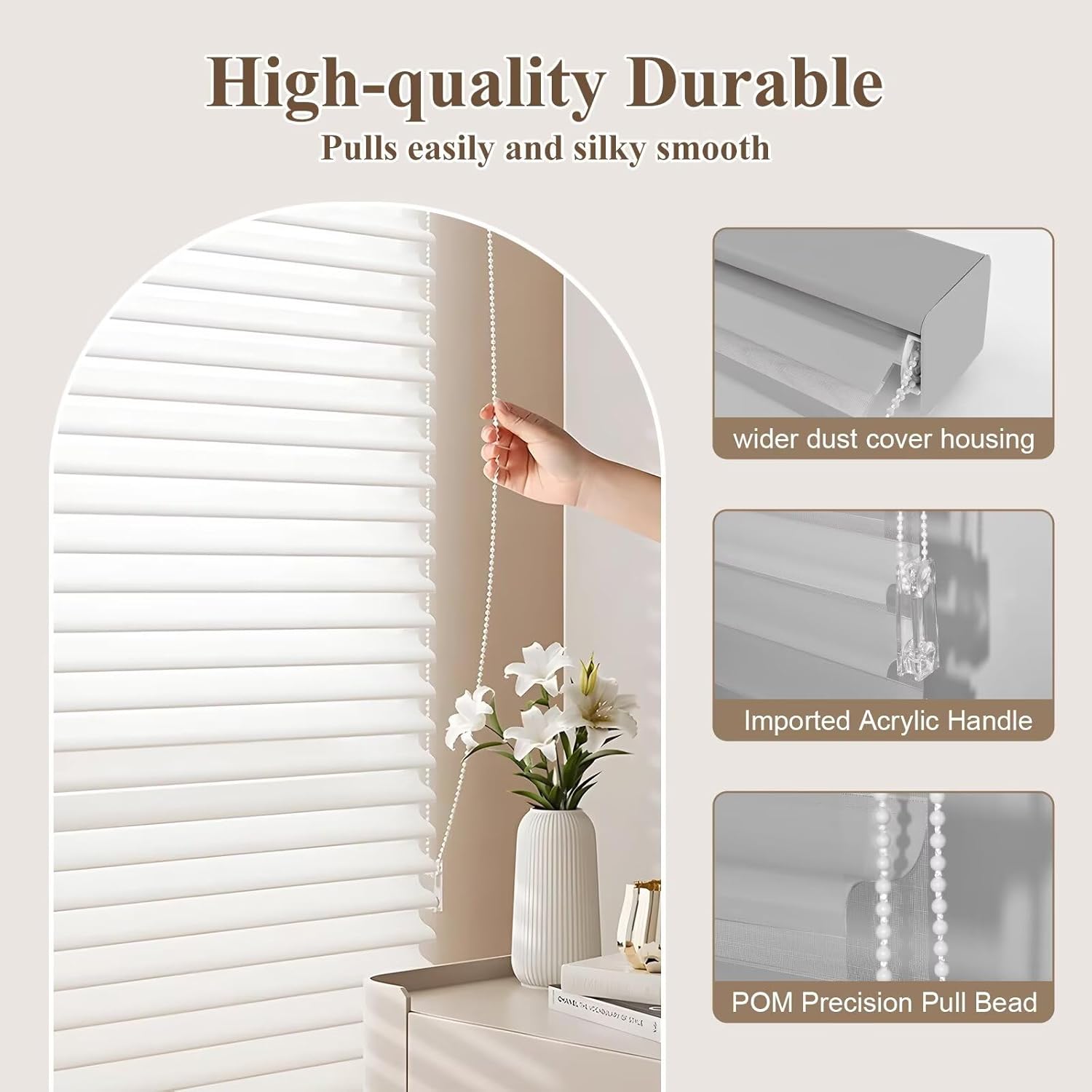 - Smooth Chain-Controlled Adjustment:Features discreet chain operation for precise height positioning. The streamlined design integrates the chain mechanism directly into the blinds, enabling effortless light control while maintaining a clean, minimalist profile for enhanced safety.