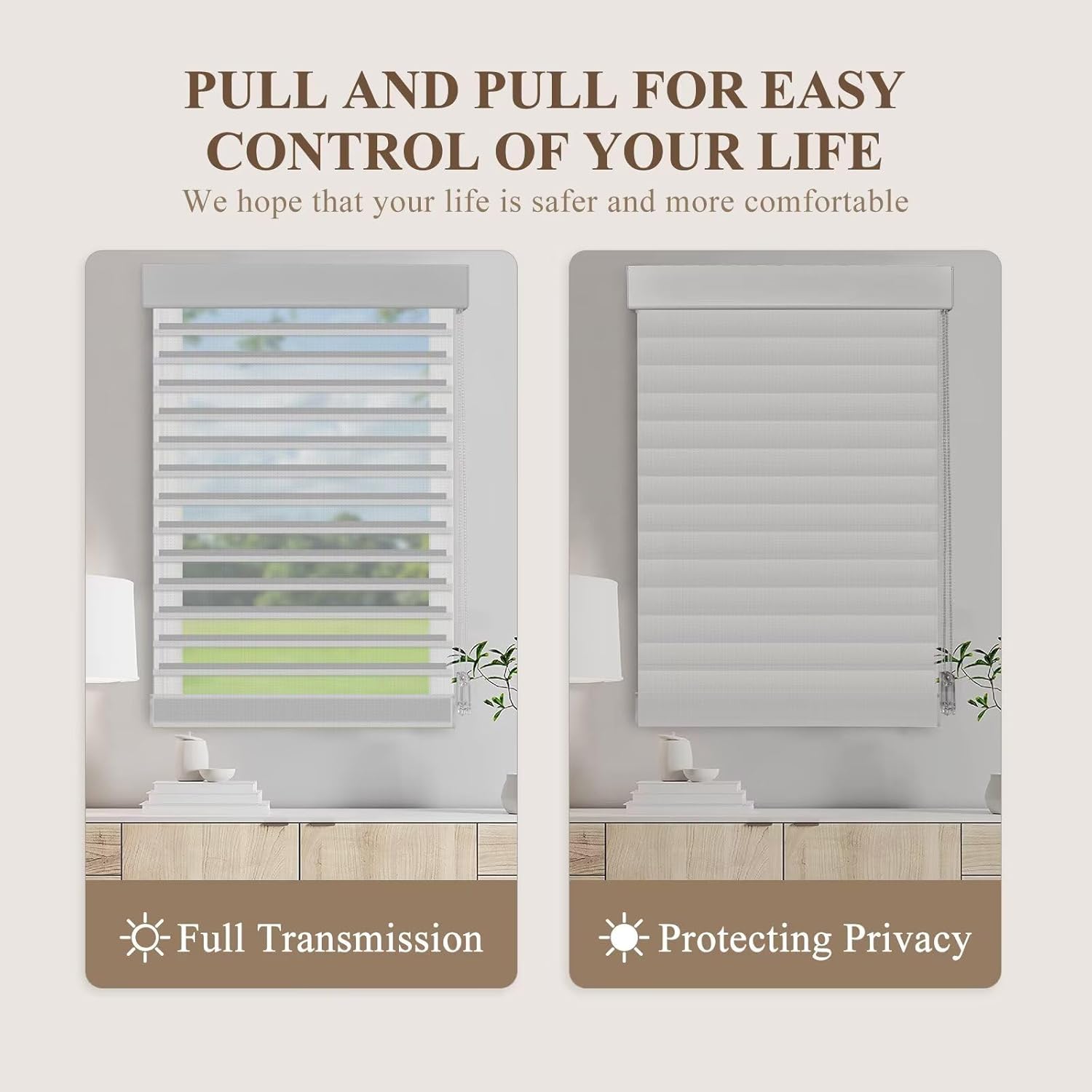- Adjustable Light & Privacy Control:Shift between soft diffused light and enhanced privacy with a simple adjustment. The innovative fabric layers reduce glare without blocking views entirely, ideal for bright living rooms, bedrooms, or home offices.