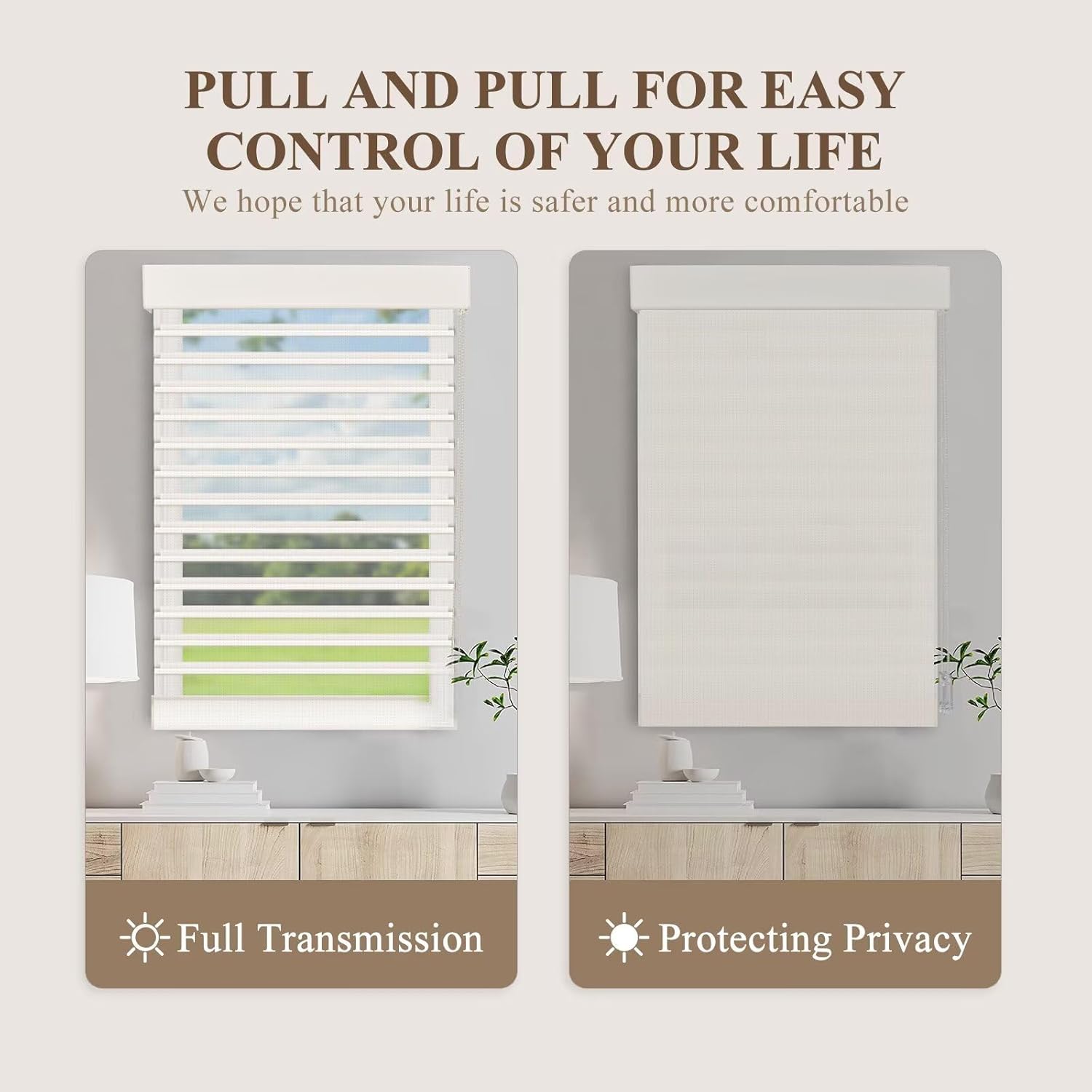 - Adjustable Light & Privacy Control:Shift between soft diffused light and enhanced privacy with a simple adjustment. The innovative fabric layers reduce glare without blocking views entirely, ideal for bright living rooms, bedrooms, or home offices.