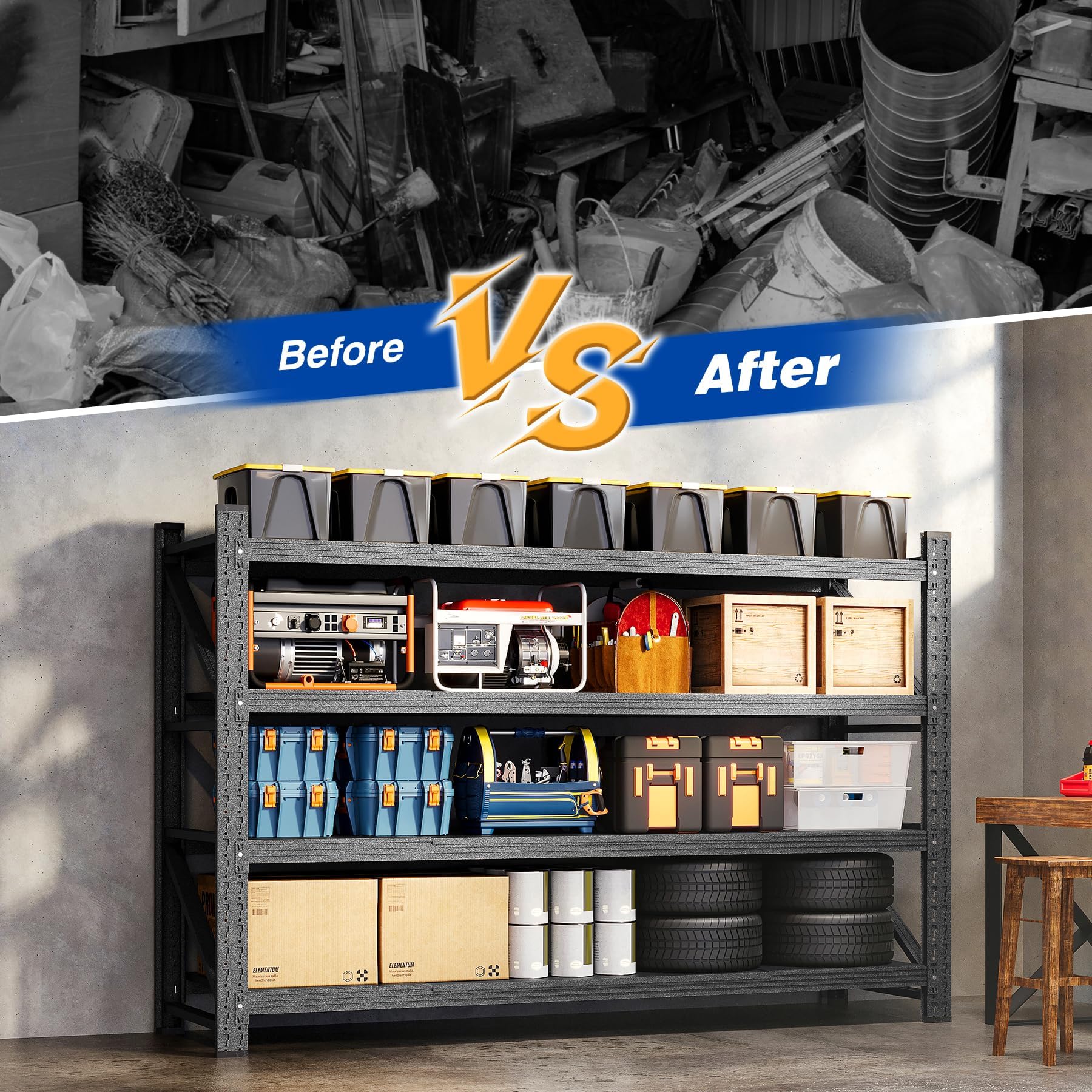 | Extra large product size: The heavy-duty shelving are 71"W x 24"D x 69"H, and have been widened and upgraded horizontally. They have an extra-large width of 48 inches, which can store more items and are suitable for more usage scenarios, such as garages, factories and warehouses, etc. Adjustable shelves: Metal shelving have 4 shelves that can adjust height at any time up and down. Each layer has different height matching, which can be adjusted according to the needs of using the shelves, so as to better utilize the shelf space. Excellent load-bearing: Heavy-duty shelving use high-quality steel, thickened process, and scratch-resistant surface. The shelves can bear about 5,000 pounds as a whole, which can not only meet the storage of small items, but also store some heavy machinery and industrial materials. |